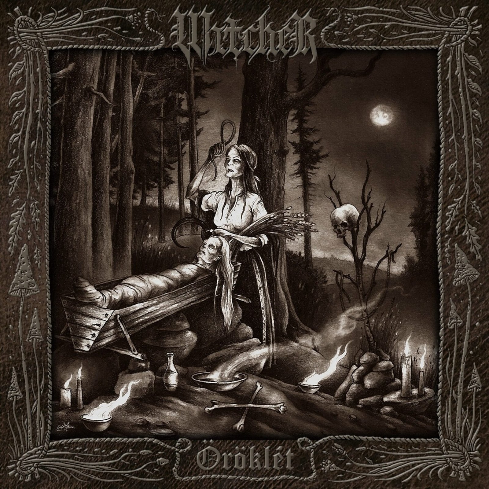The core tracks, «Röghöz kötött» and the eponymous «Ӧröklét», unfold with a measured, almost ceremonial step, reminiscent of medieval courtly dances. Unlike much of the faster Black Metal, WitcheR prioritizes emotional immersion over speed, evoking vast depths of feeling that contrast with the superficiality of modern life. The length of the tracks, all close to or above the nine-minute mark (a common feature in Atmospheric Black Metal), allows these worlds to build slowly and settle in the listener’s mind.