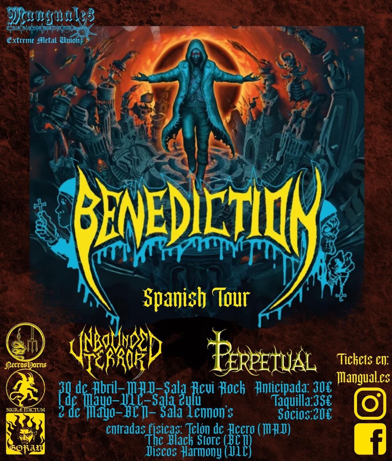 BENEDICTION, formados en Birmingham en 1989, fueron pioneros en definir el sonido más crudo y contundente del género. Con miembros que han pasado por bandas icónicas como Napalm Death, su mezcla de riffs aplastantes, voces cavernosas y actitud inquebrantable los ha convertido en una institución del metal extremo europeo.